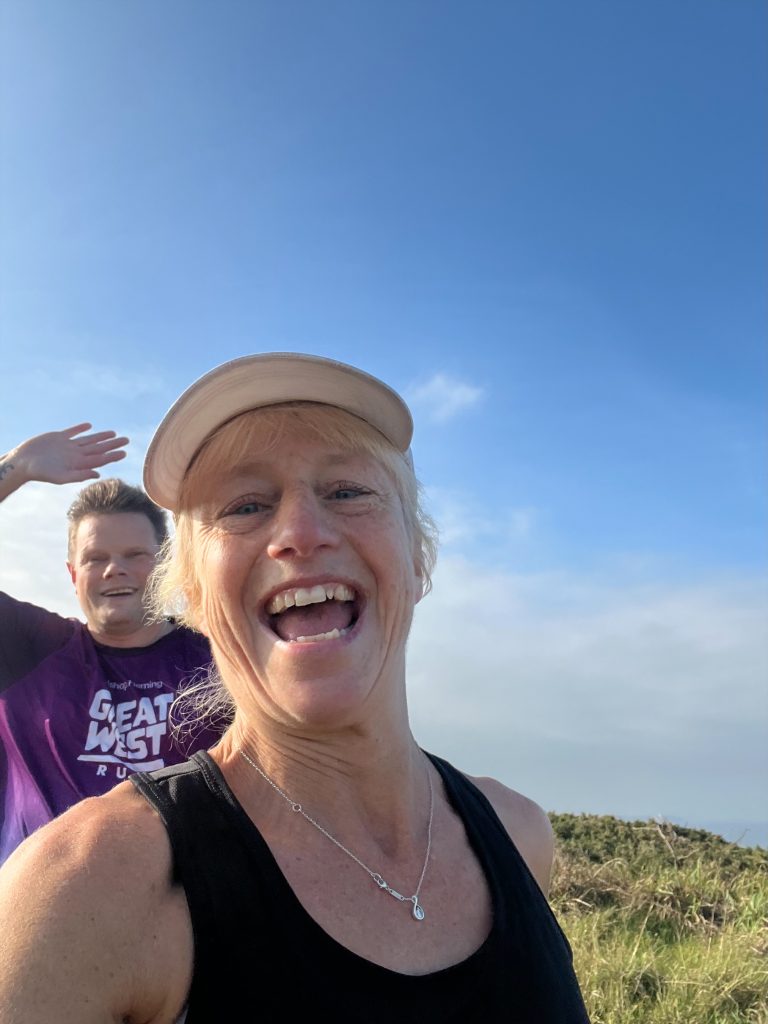 The world unfolded in colour — rugged cliffs, swirling sea, and air that clears your soul and sinuses. We ran (never jogged) along cliff tops, through stone breaks, over bridges, and into kissing gates — Paula’s favourite part: she gets a kiss, I get a breather.